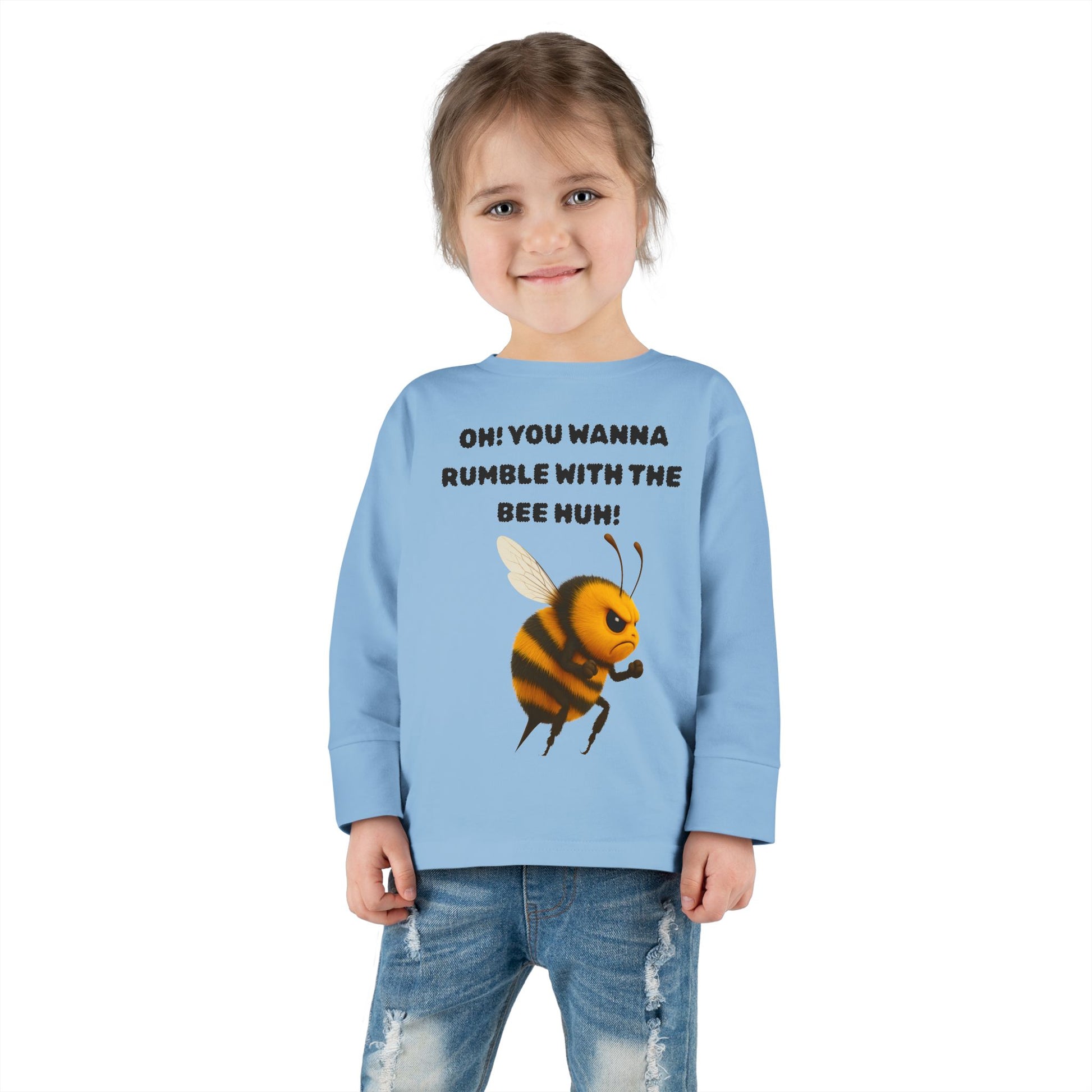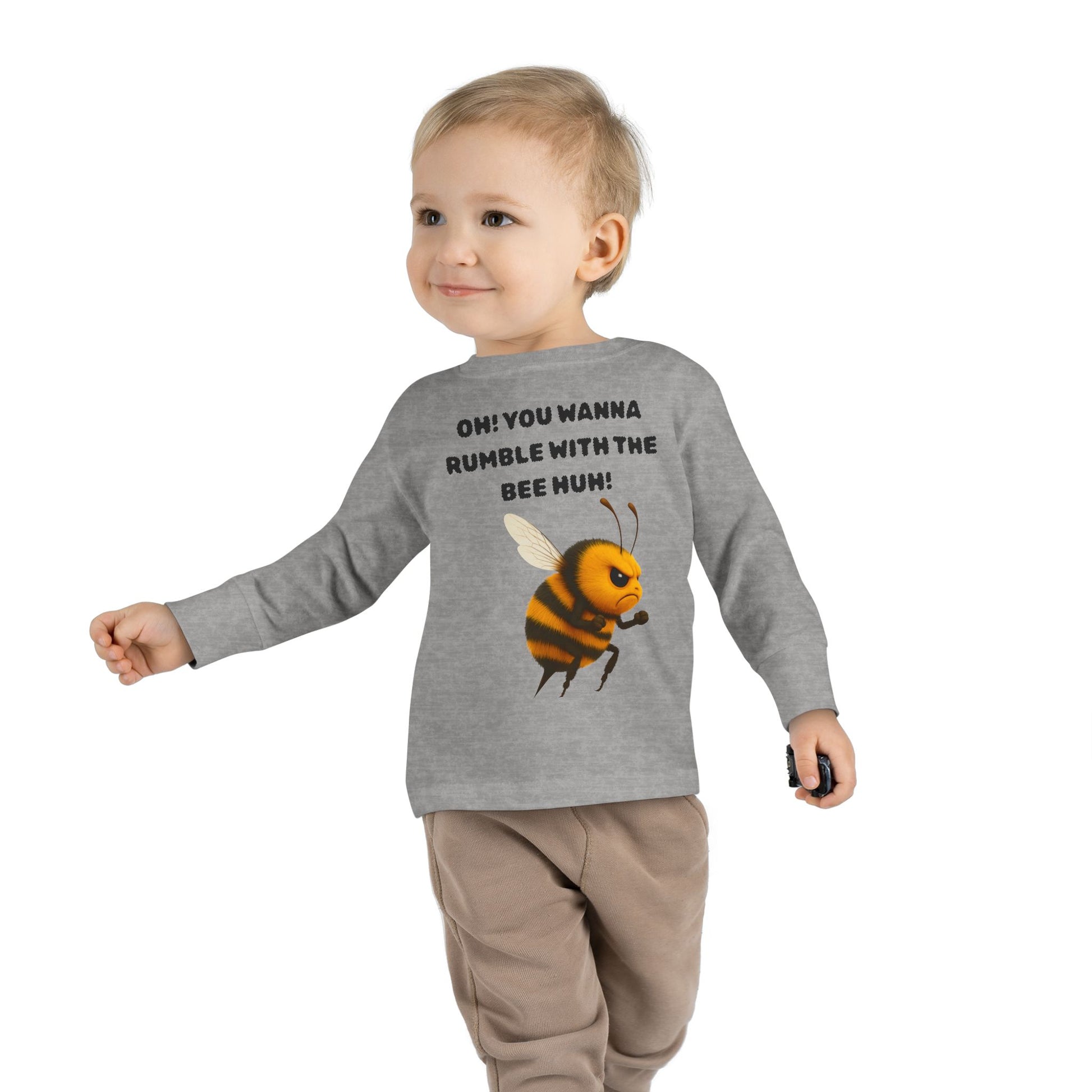 This funny rumble with the bee toddler tee long sleeve is perfect for the playful and energetic little ones. The light fabric and comfortable fit make it ideal for everyday wear or as a fun addition to a themed party or playdate. The design will bring a smile to any child's face, making it a great gift for birthdays, holidays, or just because.