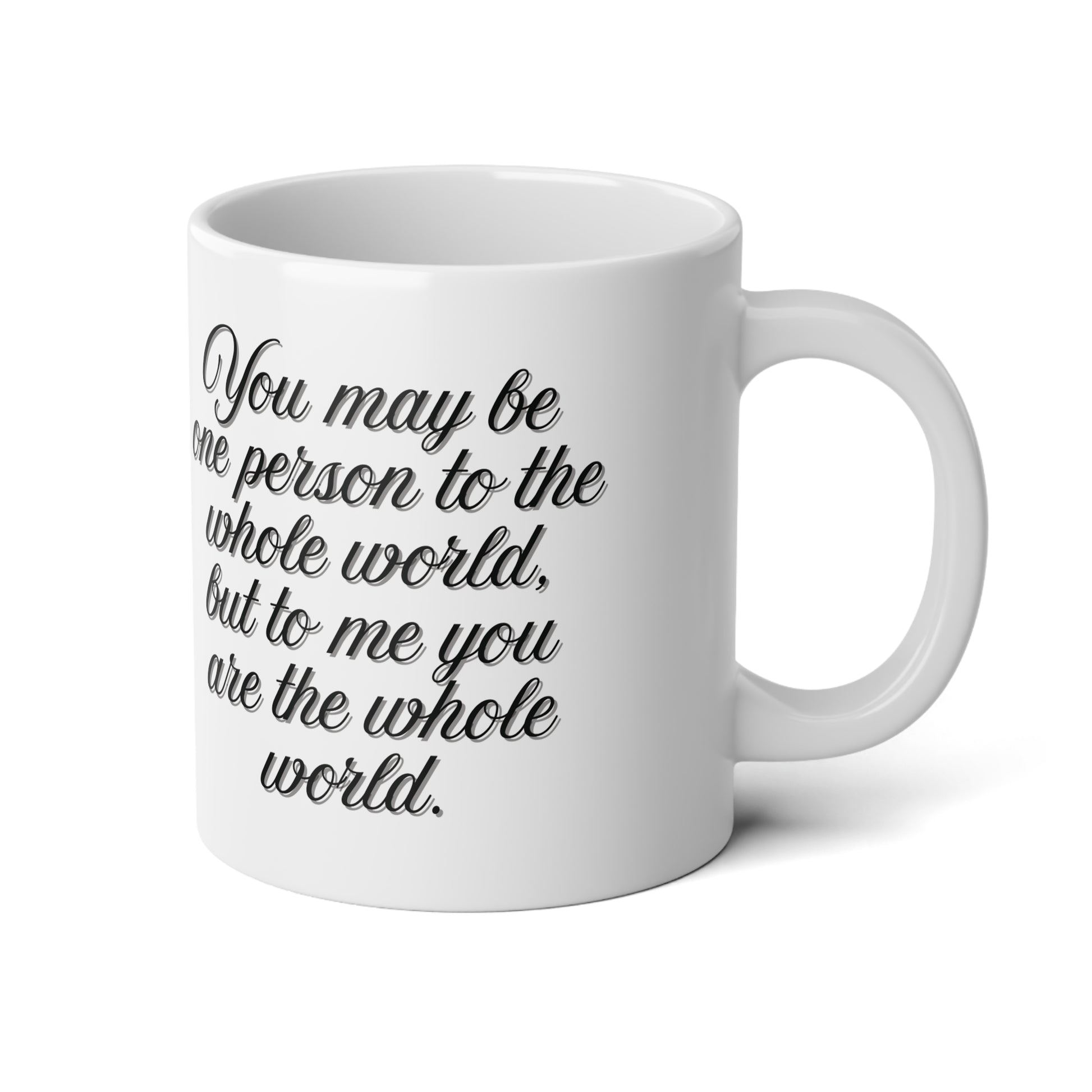Welcome your little one with a jumbo 20oz keepsake mug featuring a baby photo name and birth date inside a heart design. The mug includes the quote You may be one person to the whole world but to me you are the whole world making it a treasured memory for years.
