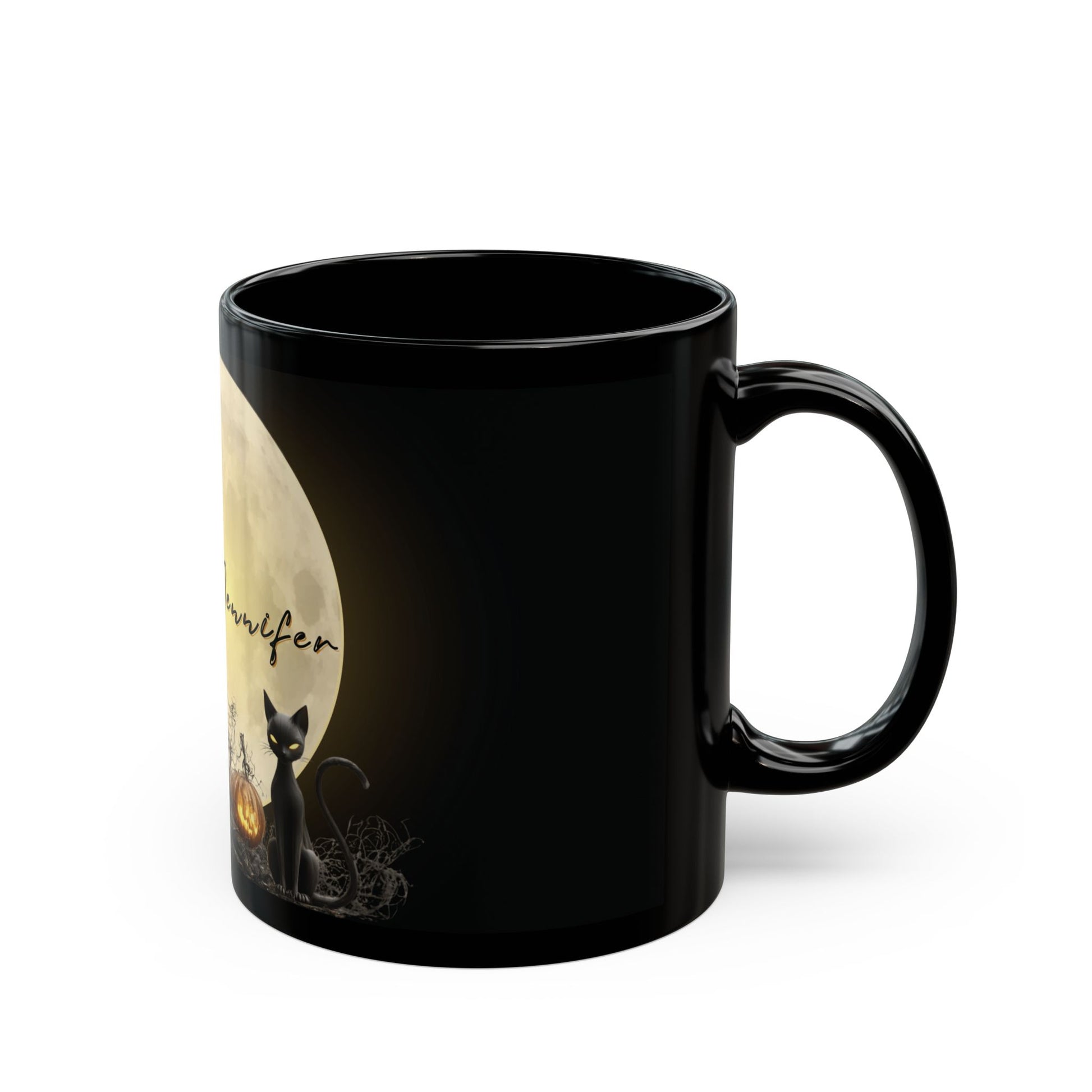 Personalized Halloween Witch Mug with Black Cat & Moon – Custom Name – 11oz / 15oz Black Glossy Ceramic Coffee Cup