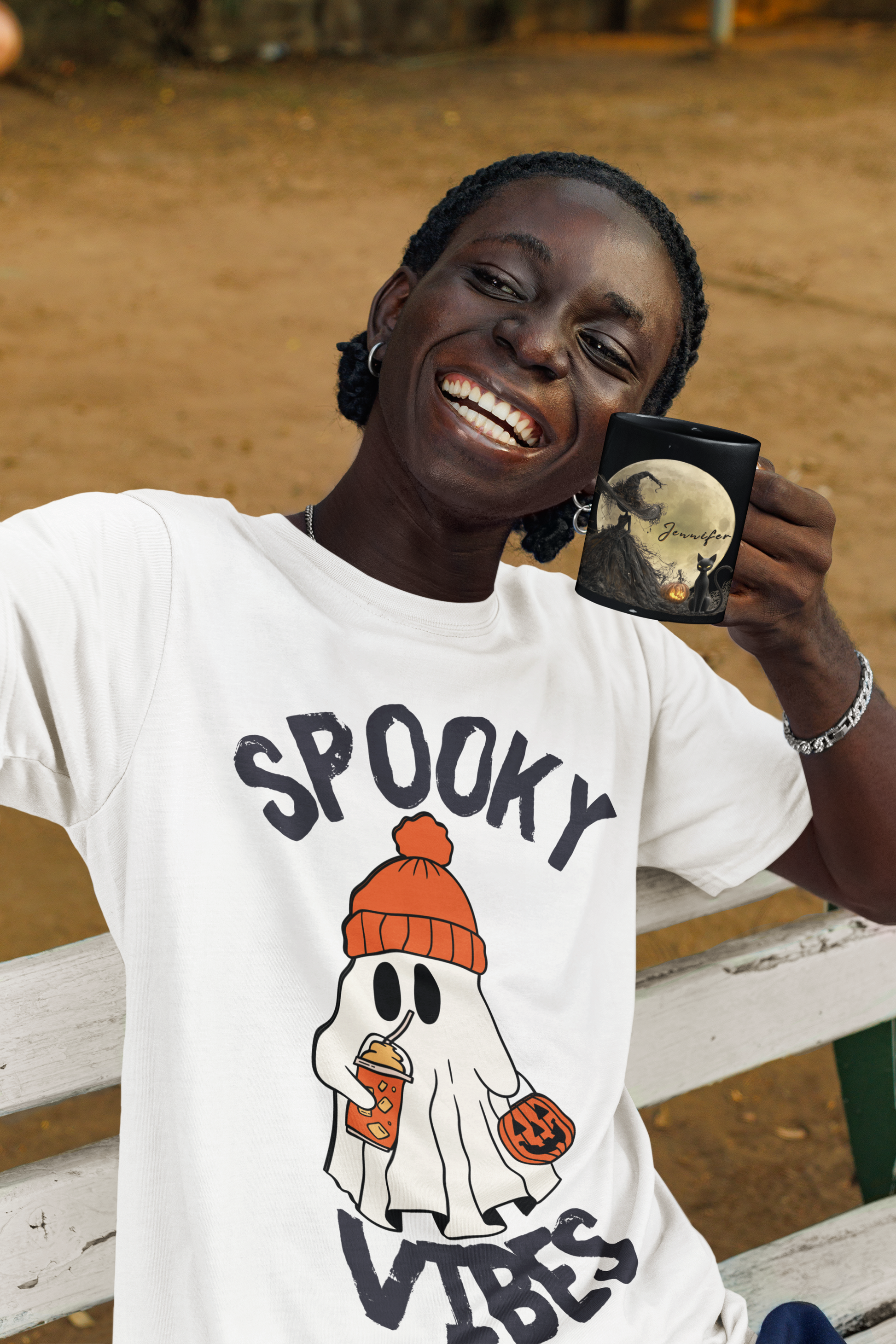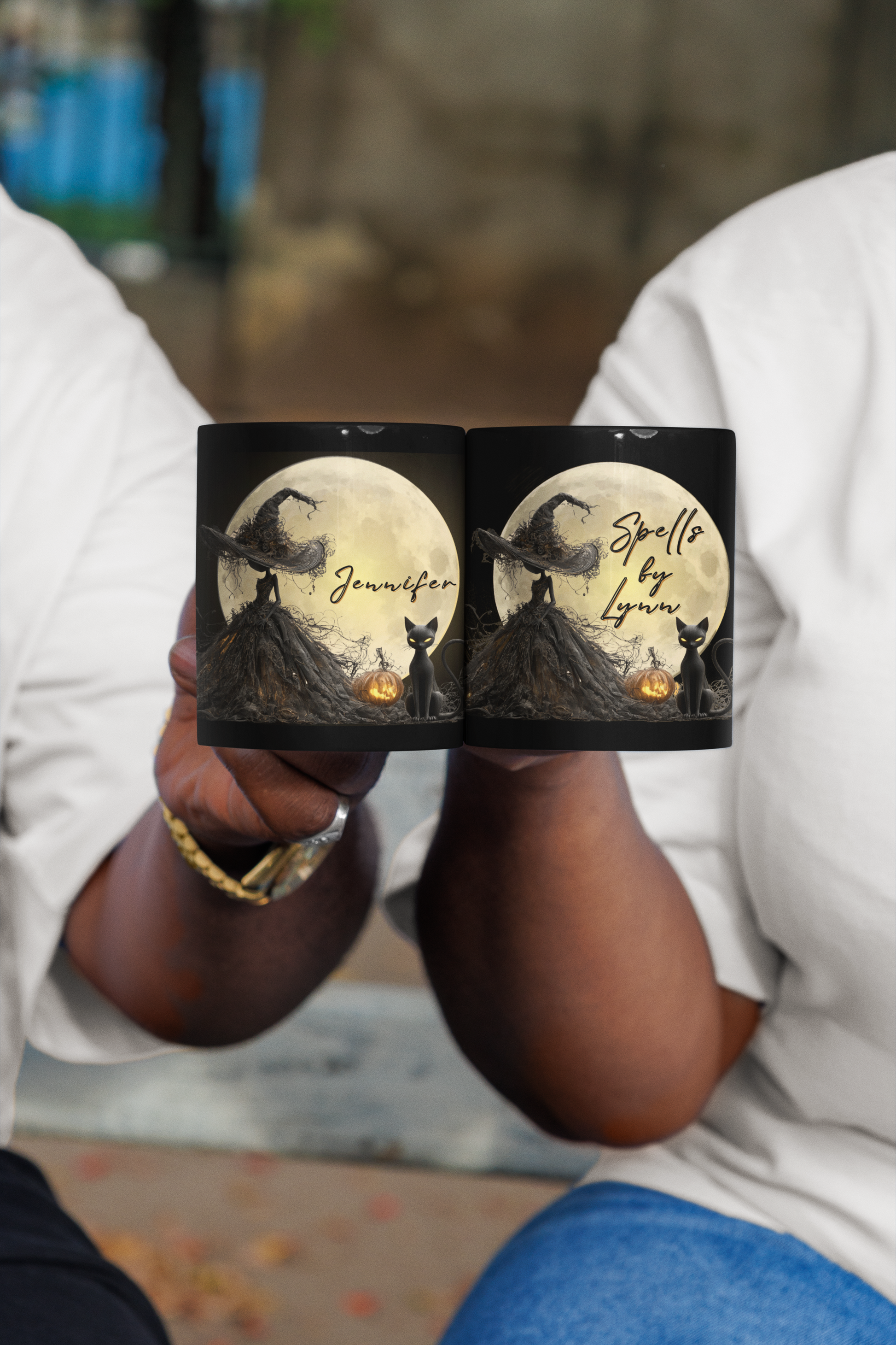Sip your favorite brew under the full moon with this spooky elegant personalized Halloween mug. Featuring a mysterious witch in a flowing gown, a glowing jack-o’-lantern, and a watchful black cat, this enchanting design is the perfect balance of gothic and whimsical.