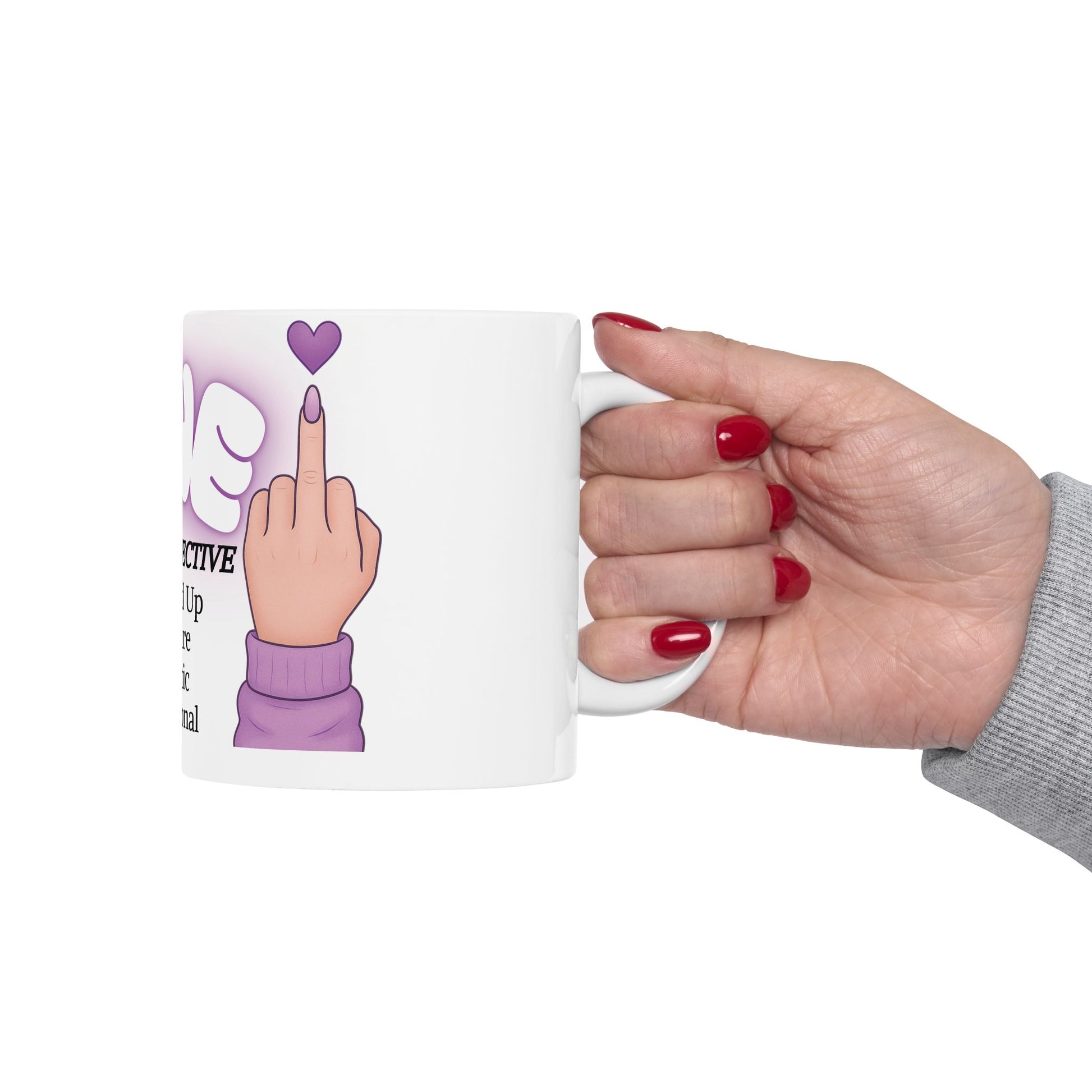 Sarcasm never looked so cute. This purple aesthetic FINE definition mug shows off bold bubble letters and a feminine hand flipping the middle finger with a glowing heart. Equal parts pretty + petty — just how your coffee likes it.