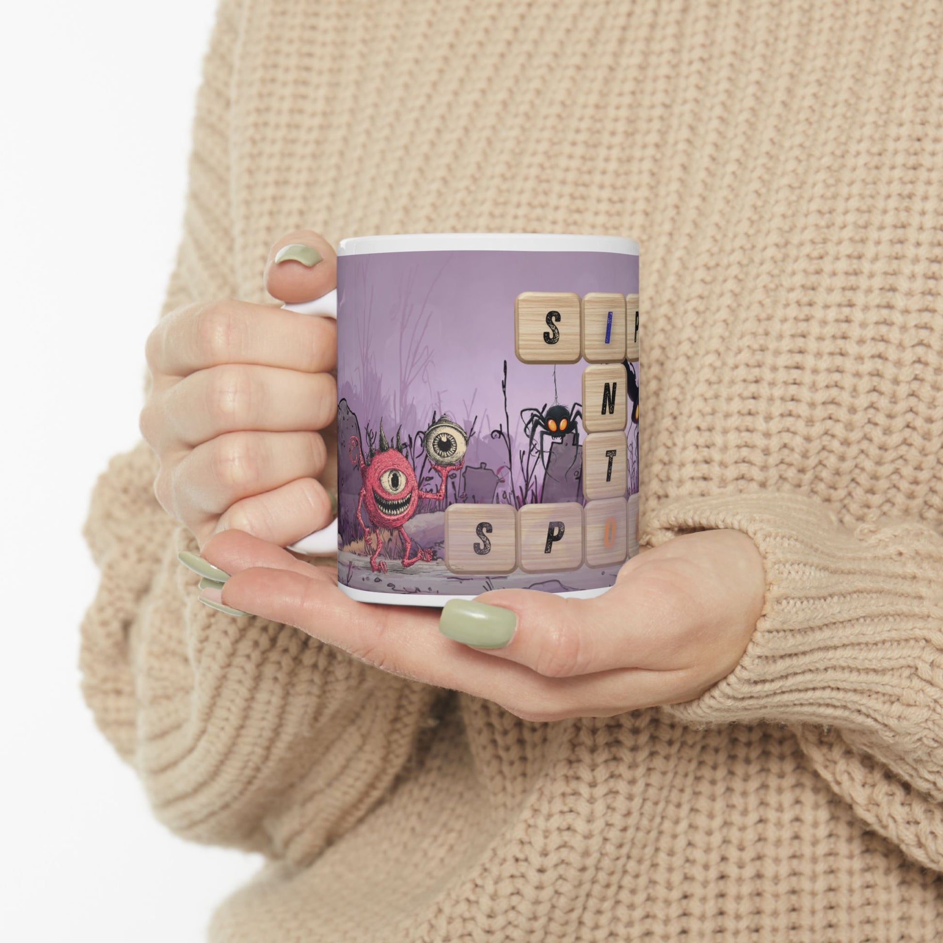Start your day with a touch of spooky fun! This whimsical ceramic mug features playful Scrabble-style tiles, quirky monsters, and a festive Halloween vibe. Perfect for sipping coffee, tea, or cocoa, it blends seasonal charm with everyday functionality. Whether you’re treating yourself or gifting it to a Halloween lover, this mug is sure to bring a smile.